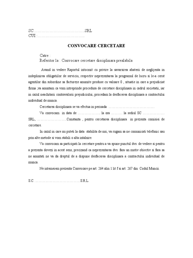 Convocare Cercetare Disciplinara