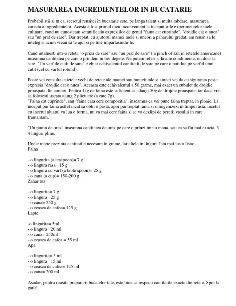 Retetele din cartile de bucate sau din caietele de retete aveau ca unitati de masura o cana o lingura sau lingurita rasa sau cu varf faina cat cuprinde la aluaturi si tot asa pur si simplu gospodina gatea mai mult organoleptic bazata pe simturi decat la cantar.