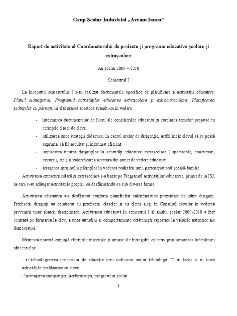 Raport De Activitate Consilier Educativ Pdf Colegiul Nae Ional
