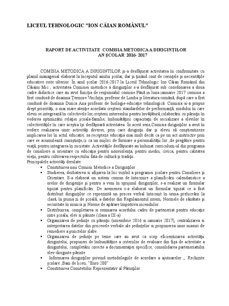 Comisia metodica a dirigintilor şi a desfăşurat activitatea în conformitate cu planul managerial elaborat la începutul anului şcolar dar şi ţinând cont de cerinţele şi necesităţile educative ivite ulterior. Raport comisia dirigintilor 2017 2018. Comisia metodica a diriginţilor an școlar 2017 2018. 0 stele 0 review uri.