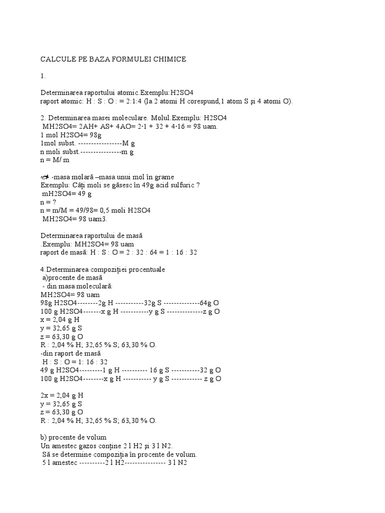 Calcule Chimice 1 Calcule Pe Baza Formulei Chimice 1 Determinarea Raportului Atomic Exemplu H2so4 Raport Atomic H S O 2 1 4 La 2 Atomi H Corespund 1 Course Hero