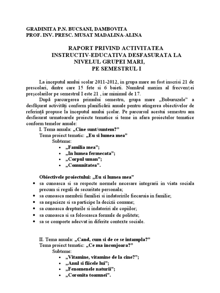 Doc Raport Asupra Activității Desfășurate Pe Semestrul I Anul