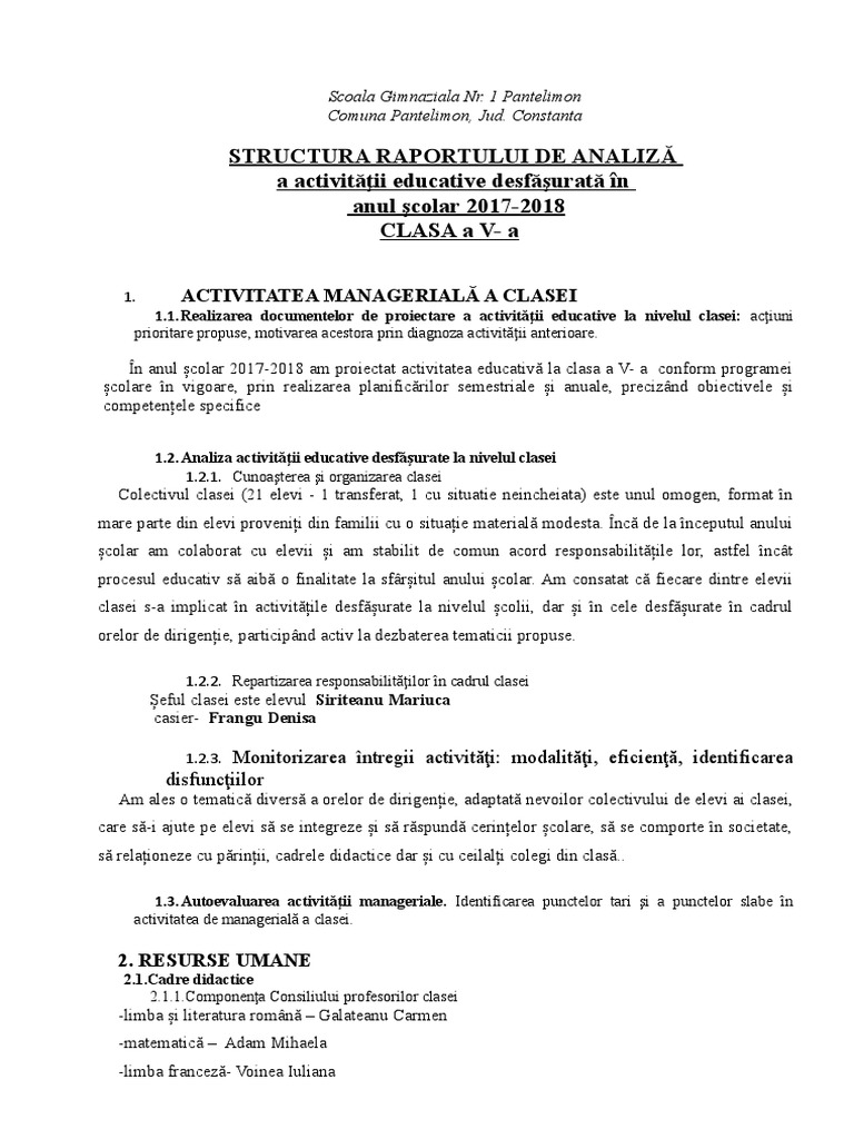 Structura Raport Semestrial Activitate De Diriginte Cls 5 An 2017 2018
