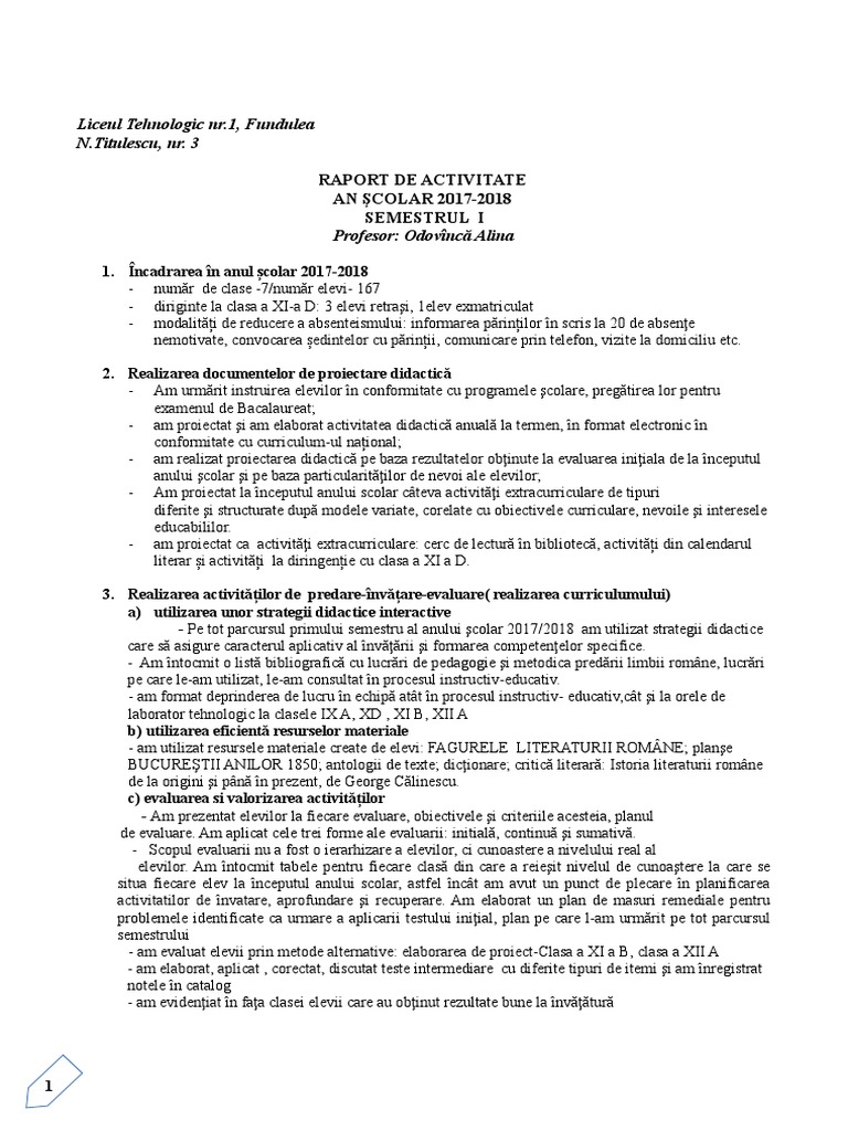 Raport De Activitate Limba Si Literatura Romana Pdf Ctim