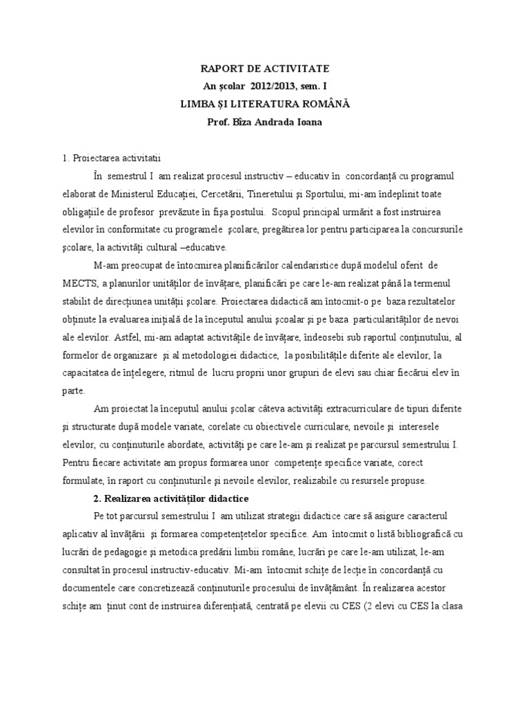Raport de activitate profesor limba romana. Raport de activitate la disciplina limba şi literatura română pentru anul şcolar 2014 2015 motto. Popovici monica profesor lb engleza gr ii 3. Raport de activitate semestrul i. Raport de activitate semestrul i an școlar 2017 2018.