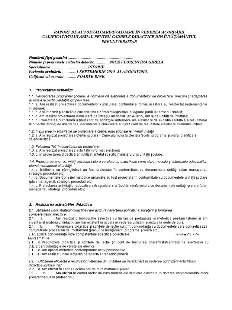 Raport De Autoevaluare In Vederea Acordarii Calificativului