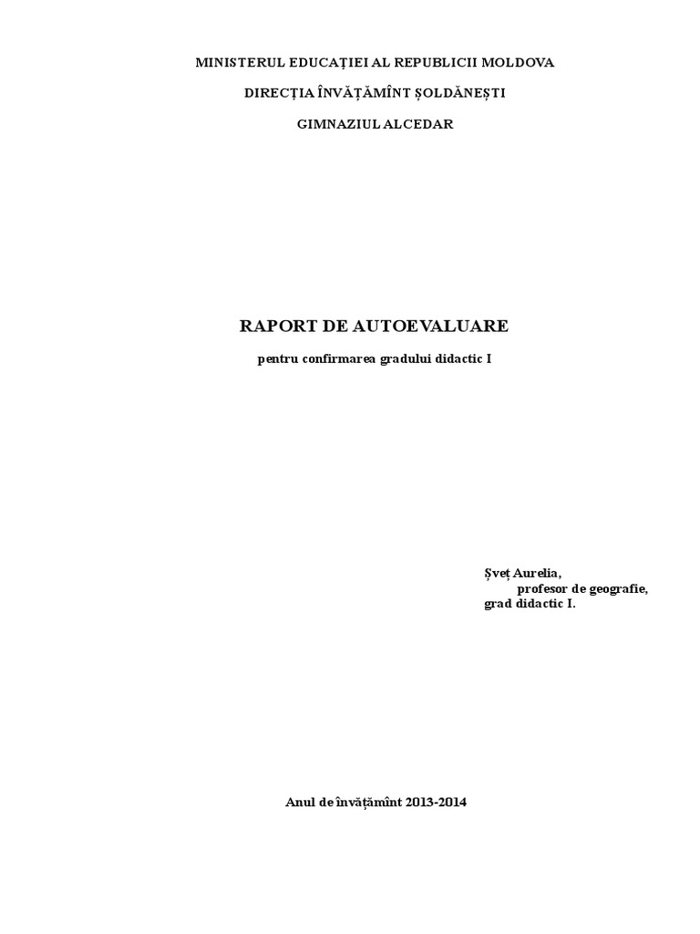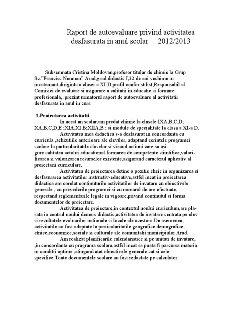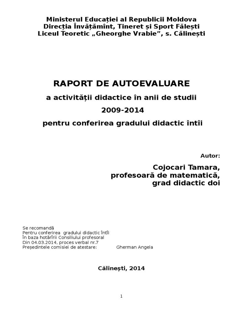Raport De Autoevaluare Pentru Conferirea Gradului Didactic I By