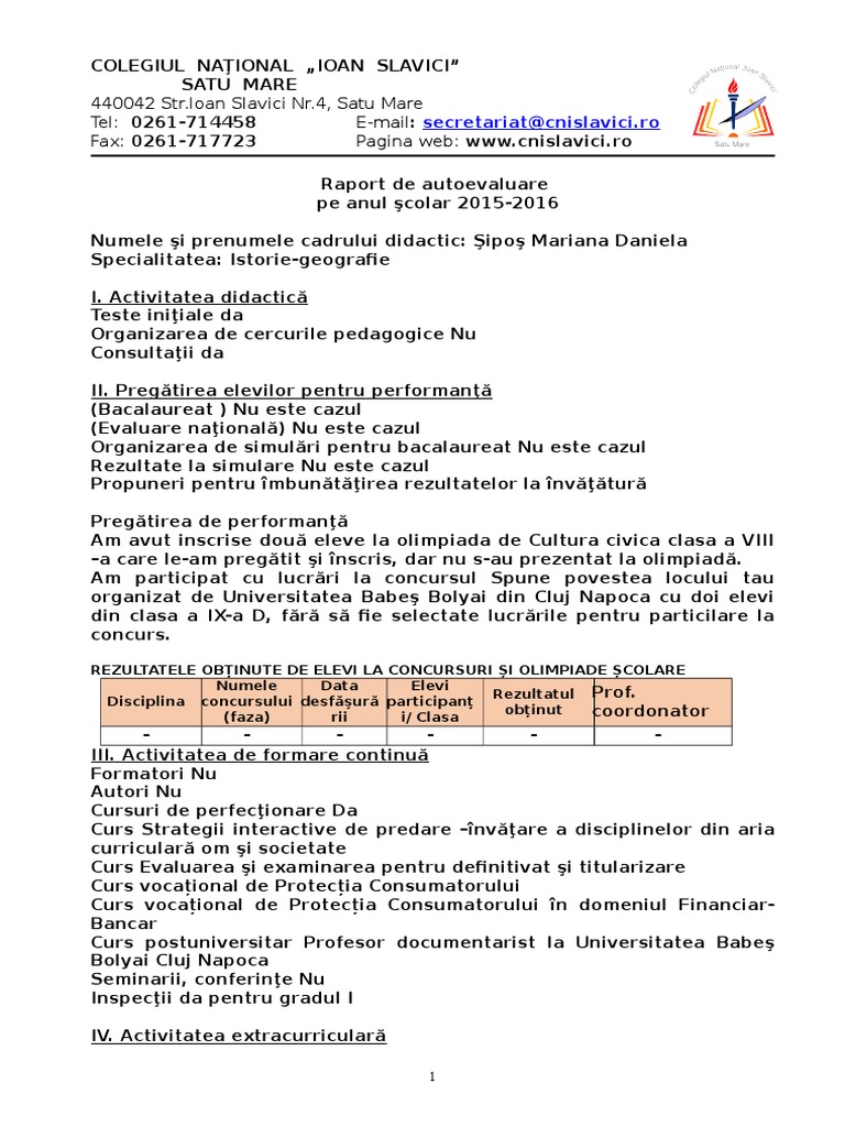 Doc Raport De Autoevaluare Evaluare In Vederea Acordării Calificativului Anual Pentru Cadrele Didactice Din Invăţămantul Preuniversitar Doina Vieru Academia Edu