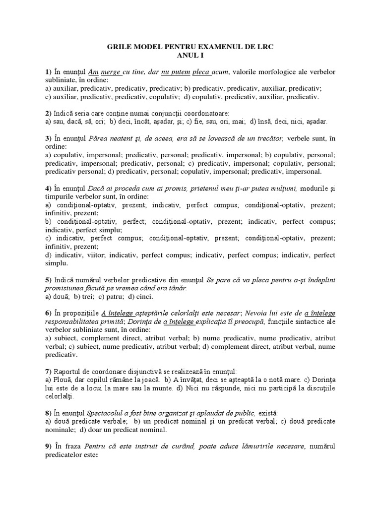 Grile Pentru Subiecte Exam Lrc An I Morfosintaxa