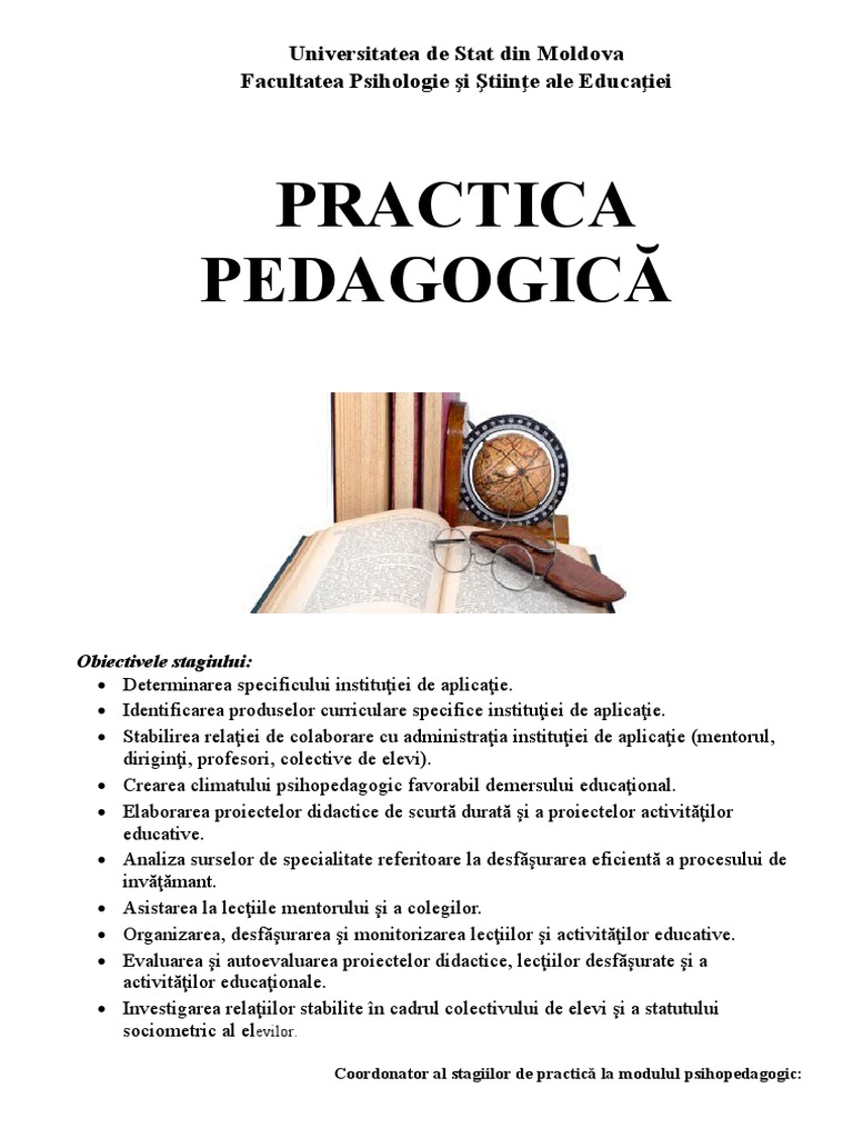 14 august 2012 08 48. Lucrarea de faţă răspunde necesităţilor studentului de a avea un instrument de lucru util în observarea şi evaluarea într o primă etapă a activităţii didactice şi în proiectarea în final a unor activităţi didactice tip lecţie în principal. Relaţia dinamică deschisă constructivă pe care o veţi stabili la practica pedagogica cu tutorele metodicianul responsabilul comisiei metodice directorul instituţiei de învăţământ şi cu alte persoane competente este cheia succesului dumneavoastr ă. O grupa care efectueaza practica pedagogica are in componenta sa 8 12 studenti.