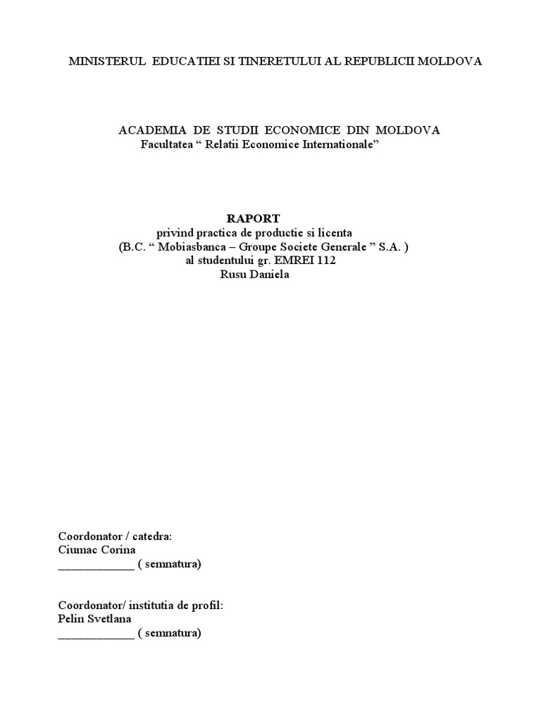 Proiect Raport De Practica Bc Moldova Agroindbank Sa Economie