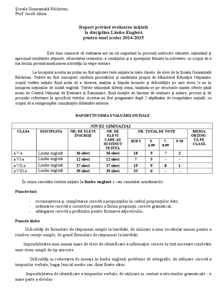 Raport Privind Evaluarea Iniţială La Disciplina Limba Engleza