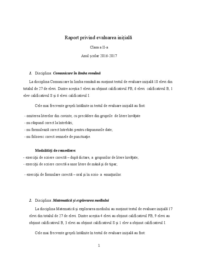 Raportul cuprinde concluziile privind evaluarea initiala pe discipline. Raport evaluare initiala limba romana. 10 octombrie 2013 09 34. 3 august 2018 04 53.