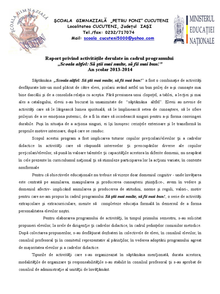 Raport Final școala Altfel Să știm Mai Multe Să Fim Mai Buni