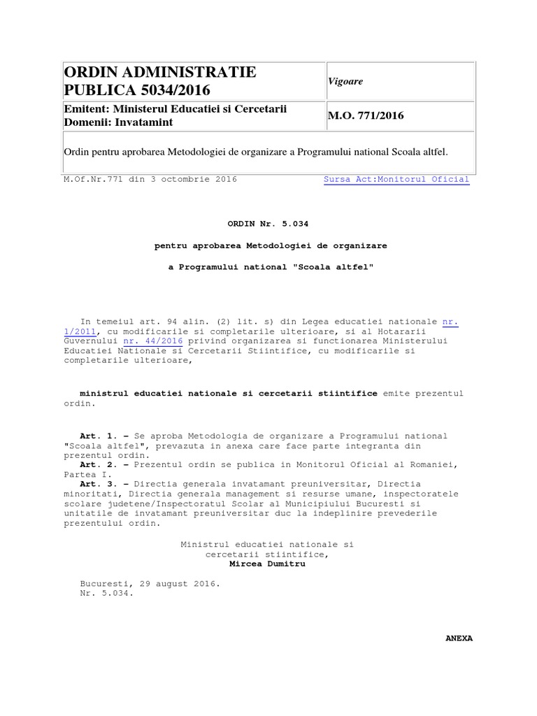 Ordin Administratie Publica 5034 2016 Emitent Ministerul Educatiei Si Cercetarii Domenii Invatamint M O 771 2016
