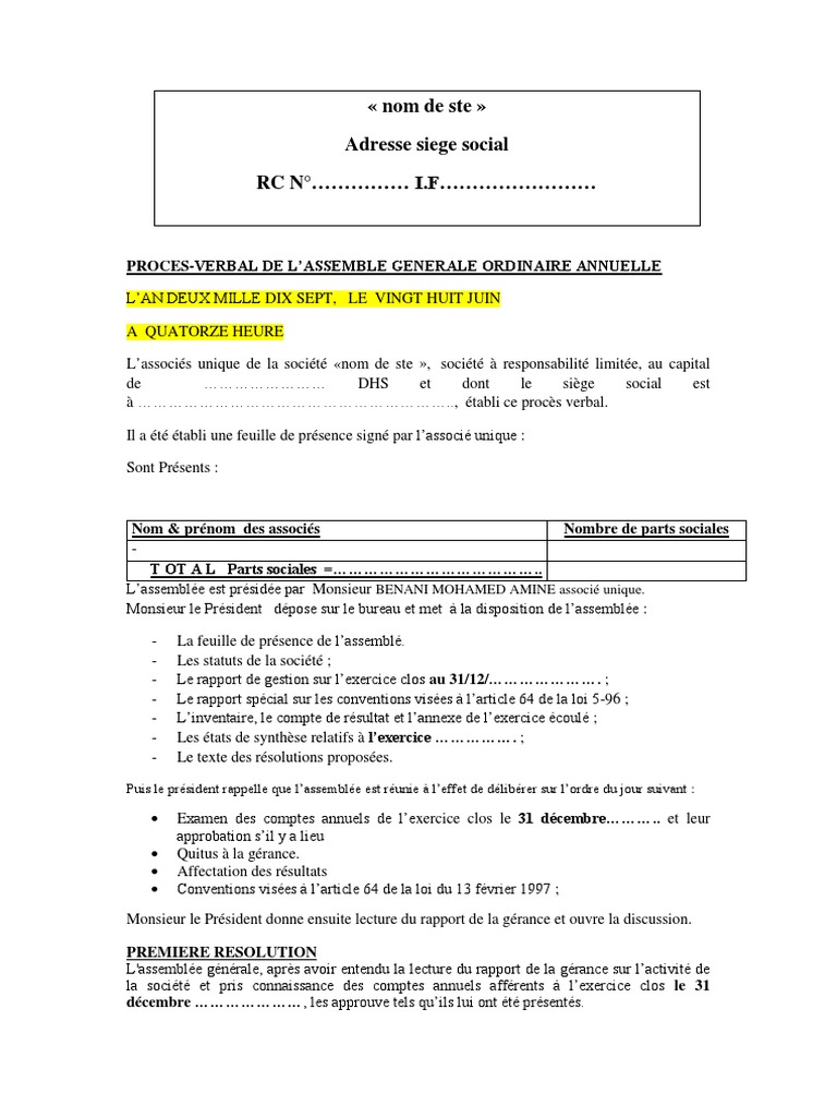 Modeles D Actes Eurl Approbation Des Comptes Annuels Avec