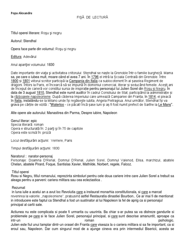 Fisa De Lectura Rosu Si Negru
